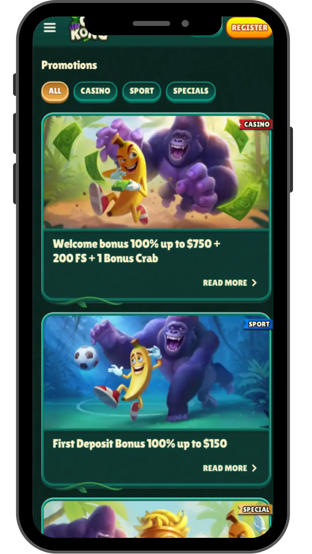 - First deposit bonus: New players who create their account on the Casino GoKong app can claim the first deposit offer. You cannot get it if you have already signed up on your desktop or browser and claimed it.